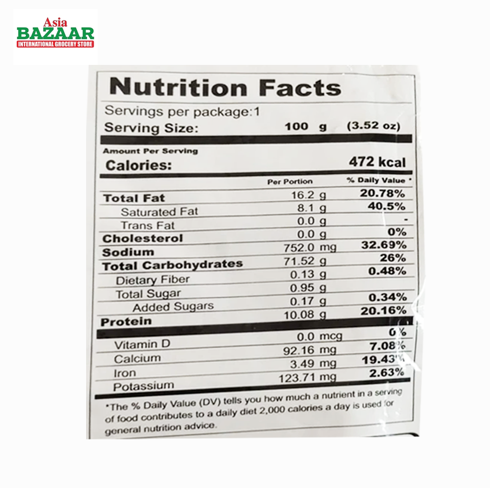 Wheat flour, edible vegetable oil (palm oil), starch, salt, acidity regulators (potassium carbonate, sodium carbonate), thickener, emulsifier.