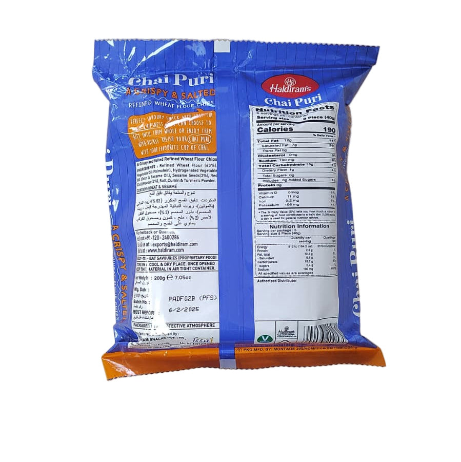Haldiram Chai Puri 200g offers a traditional Indian snack crafted with authentic spices and premium ingredients. These crisp puris provide a perfect crunchy complement to your chai, enhancing your tea-time experience with a balanced flavor profile. Conveniently packaged in a 200g pack, they are ideal for sharing or enjoying solo as a quick, satisfying bite.