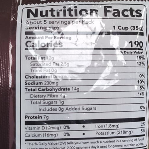 wheat flour, corn, malt, spices, chilli,chickpea flour (or gram pulse flour), vegetable oil (often cotton seed, corn, and palm), salt, and spices including black pepper, red chili powder.