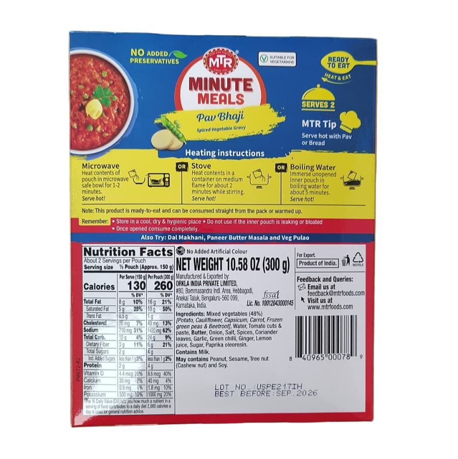 MTR Pav Bhaji 300g offers a convenient and authentic taste of traditional Indian street food. Crafted with a blend of fresh vegetables and spices, this ready-to-cook mix ensures a rich, flavorful bhaji that pairs perfectly with soft pav buns. Ideal for those seeking a quick yet genuine culinary experience, it delivers consistent quality and taste, making it an expert choice for busy kitchens or home cooks aiming for authentic flavor with minimal effort.