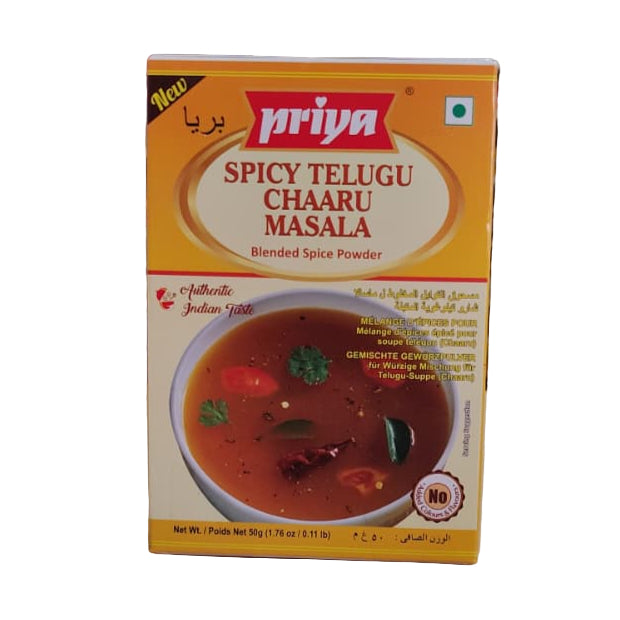 Priya Spicy Telegu Chaaru Masala 50g offers an authentic blend of traditional Telugu spices crafted to enhance your charu, a tangy and spicy South Indian soup. This carefully balanced masala combines chili, cumin, coriander, and other regional ingredients, delivering a vibrant flavor profile that deepens the dish’s taste complexity. Ideal for home cooks seeking to replicate genuine Telugu cuisine, it effortlessly elevates meals with consistent, rich seasoning in every preparation.